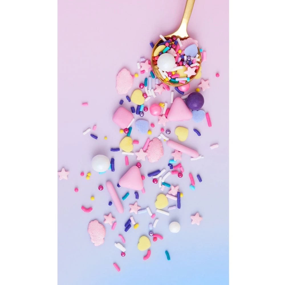 California Dreamland Sprinkle Medley is a premium, one of a kind mix of some of the most Barbie Camper inspired sprinkles in the universe: shades of pinks, purples, aqua and yellow jimmies, shimmery pink cloud confetti, shimmer stars, yellow and lavender hearts, matte jumbo sugar shapes, candy beads, candy-covered chocolate balls, tiny dragées, sparkly sugar and more.