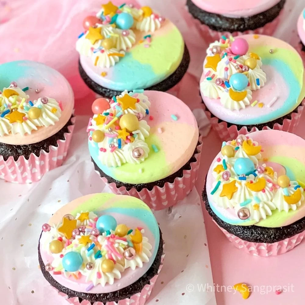JUST A DREAMER Sprinkle Medley is a premium, one of a kind mix of some of the most beautiful boho-inspired sprinkles in the universe: shades of pinks, aqua, blue, peach white sprinkles, shimmery gold moon confetti in 3 sizes, shimmery gold moon confetti, white pearls, candy beads, candy-covered chocolate balls, rose gold and pink dragées, sparkly sugar and more.